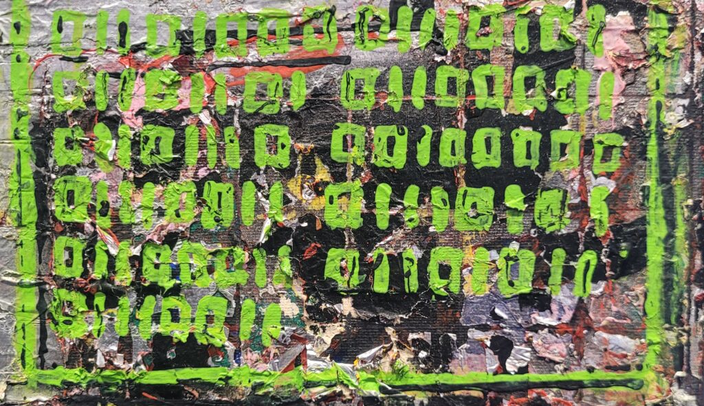 Neu zu sehen sind unter anderem Werke von Svent-Patrick Koch. Er beschreibt seine Arbeiten als abstrakt und neoexpressionistisch, prozessorientiert und offen für das, was beim Betrachten entsteht. Er arbeitet nicht klassisch mit dem feinen Pinsel, sondern nutzt unterschiedliche Materialien und Werkzeuge. Seine Bilder zeigen vielschichtige Oberflächen, Schriftfragmente, überlagerte Formen und starke Kontraste. Beim längeren Hinsehen entstehen eigene Deutungen, ähnlich wie beim Blick in Wolken, in denen jede Person etwas anderes erkennt. Gleichzeitig schwingen gesellschaftliche Fragen mit, teils direkt, teils zwischen den Farbschichten verborgen. Mehr zu seinen Arbeiten findest du auf seinem Instagram Profil unter: https://www.instagram.com/intheframeofmypossibilities/