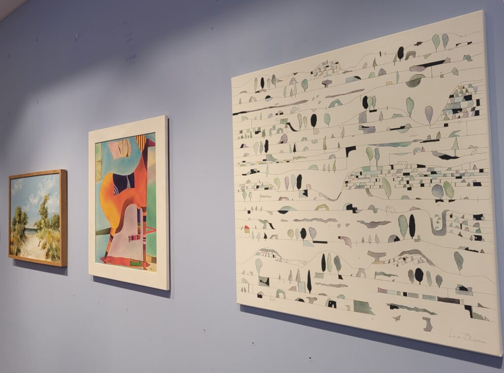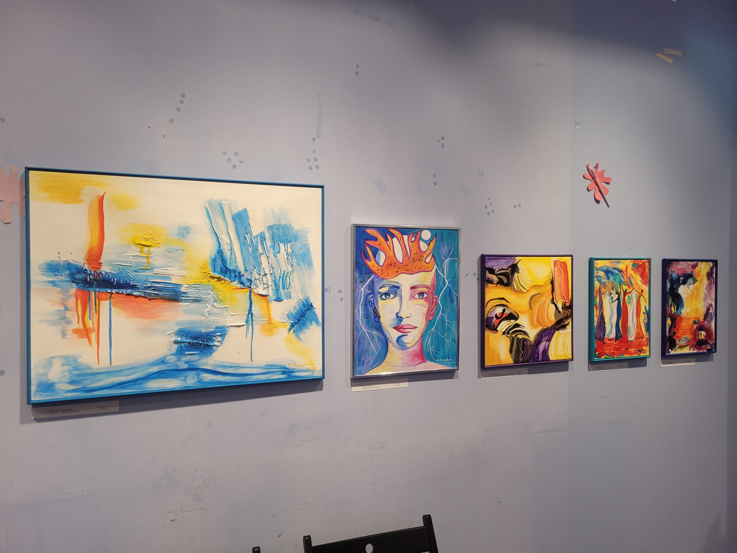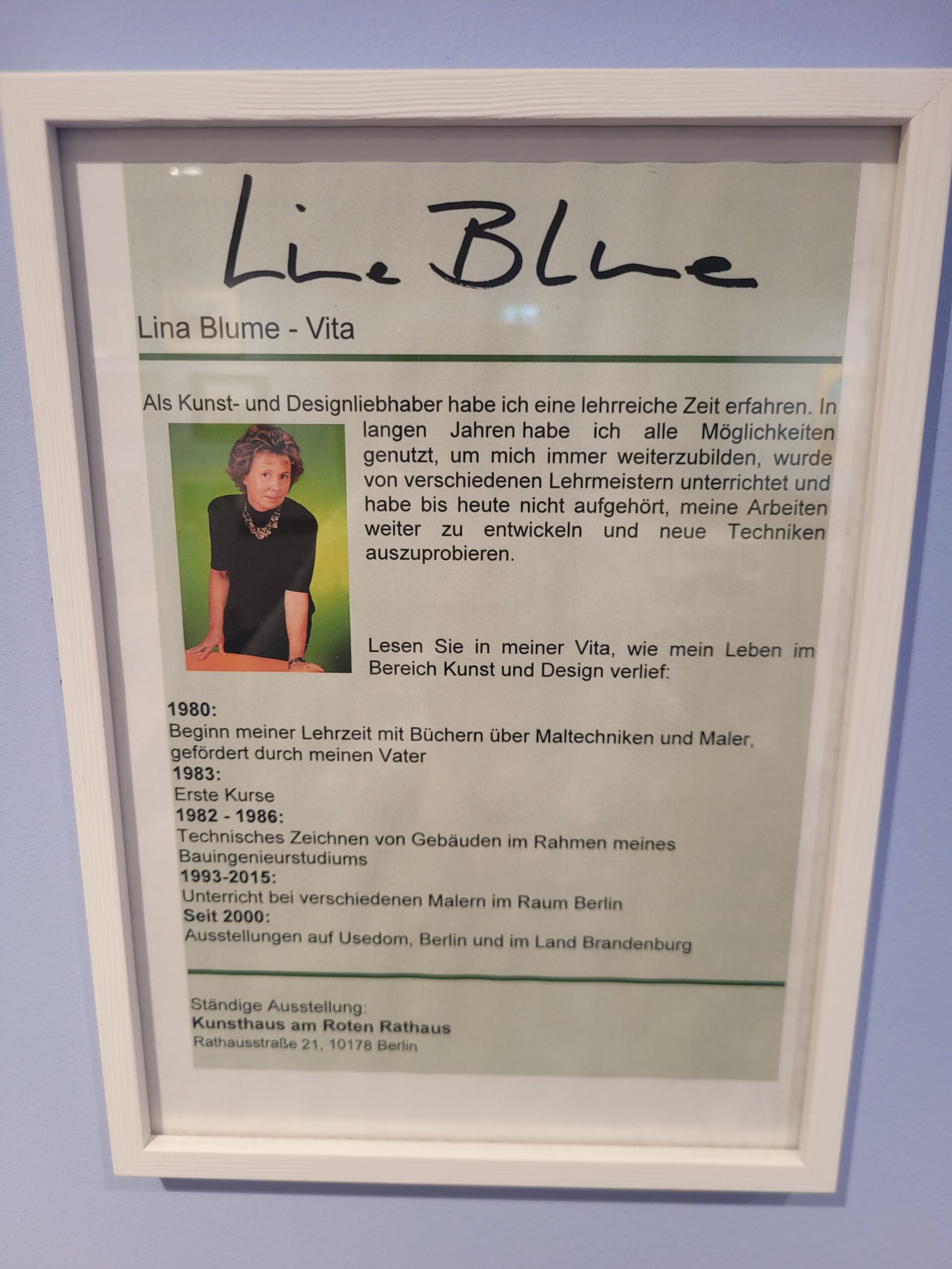 Ebenfalls neu angebracht wurden Arbeiten von Lina Blume, die unter dem Namen Line Blue ausstellt. Sie beschäftigt sich seit vielen Jahren mit Kunst und Design, begann früh mit dem Studium von Maltechniken und vertiefte ihr Können unter Anleitung verschiedener Maler im Raum Berlin. Ihr Weg führte über technisches Zeichnen im Bauingenieurstudium hin zu Ausstellungen in Berlin, Brandenburg und auf Usedom. Diese kontinuierliche Auseinandersetzung mit Form, Technik und Entwicklung spiegelt sich auch in ihren aktuellen Arbeiten im Kunstraum wider.