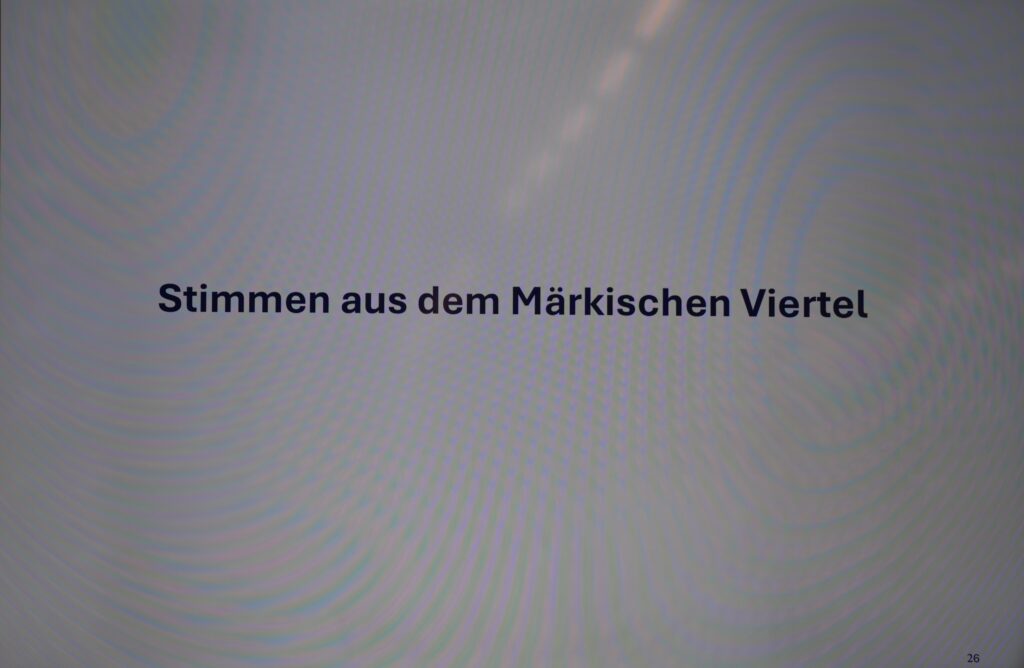 Ein zentraler Gedanke der Planung ist die Rückkehr des Brunnenplatzes. In der Präsentation wurde direkt aus märkischesviertel.de zitiert und ein Foto von 2014 gezeigt. Der Platz, den viele hier im Kopf haben mit den Bänken, den Bäumen, der Uhr und dem Brunnen, wurde als Teil der Geschichte des Viertels beschrieben, nicht nur als nette Erinnerung.