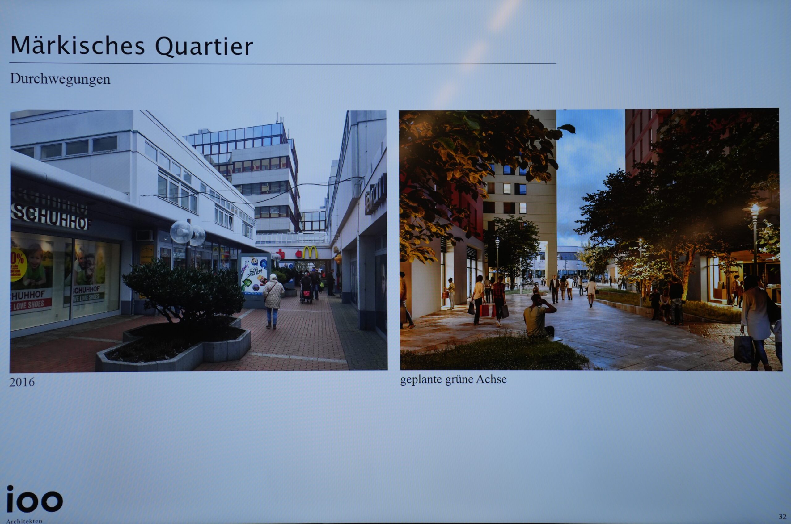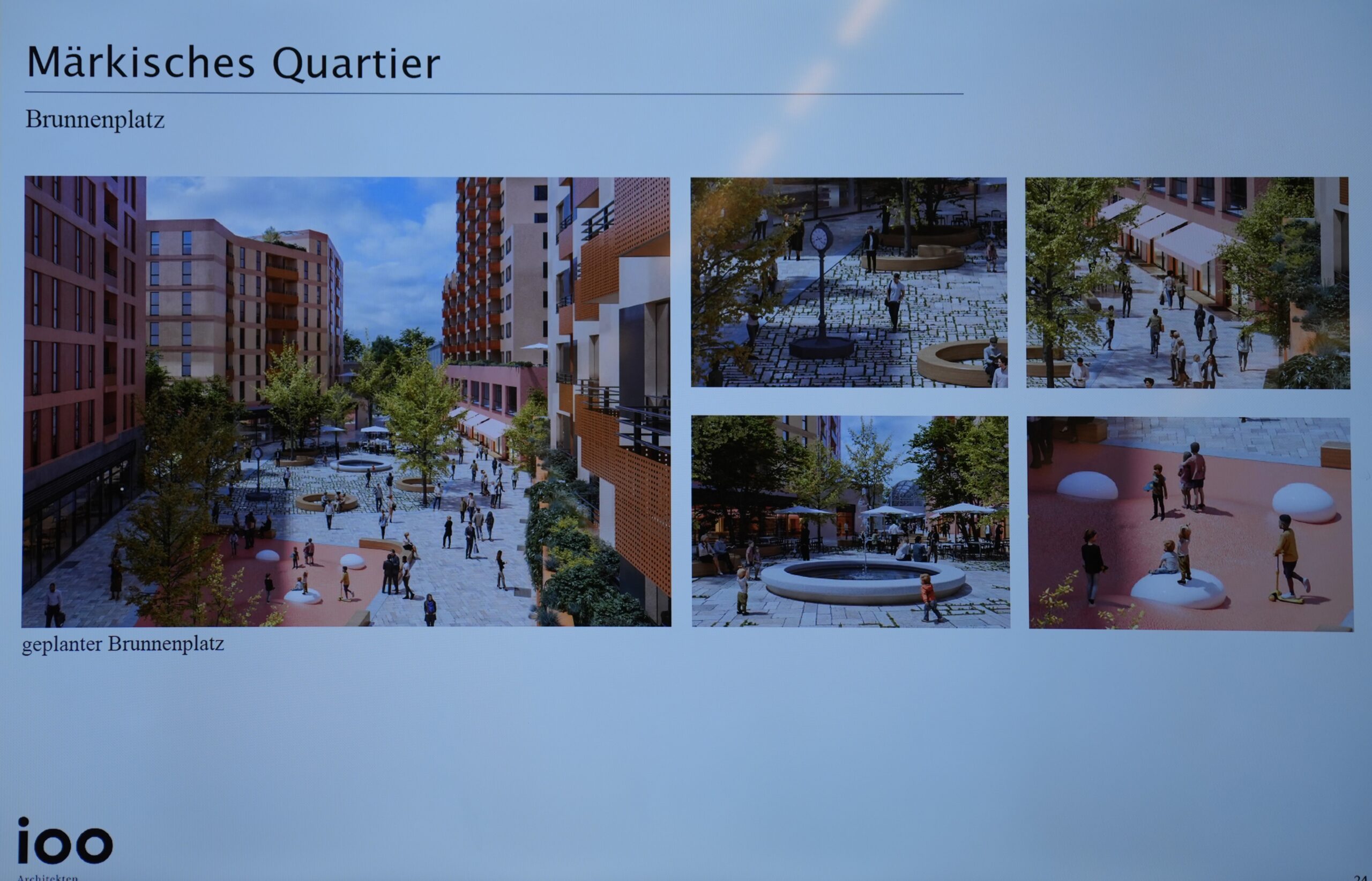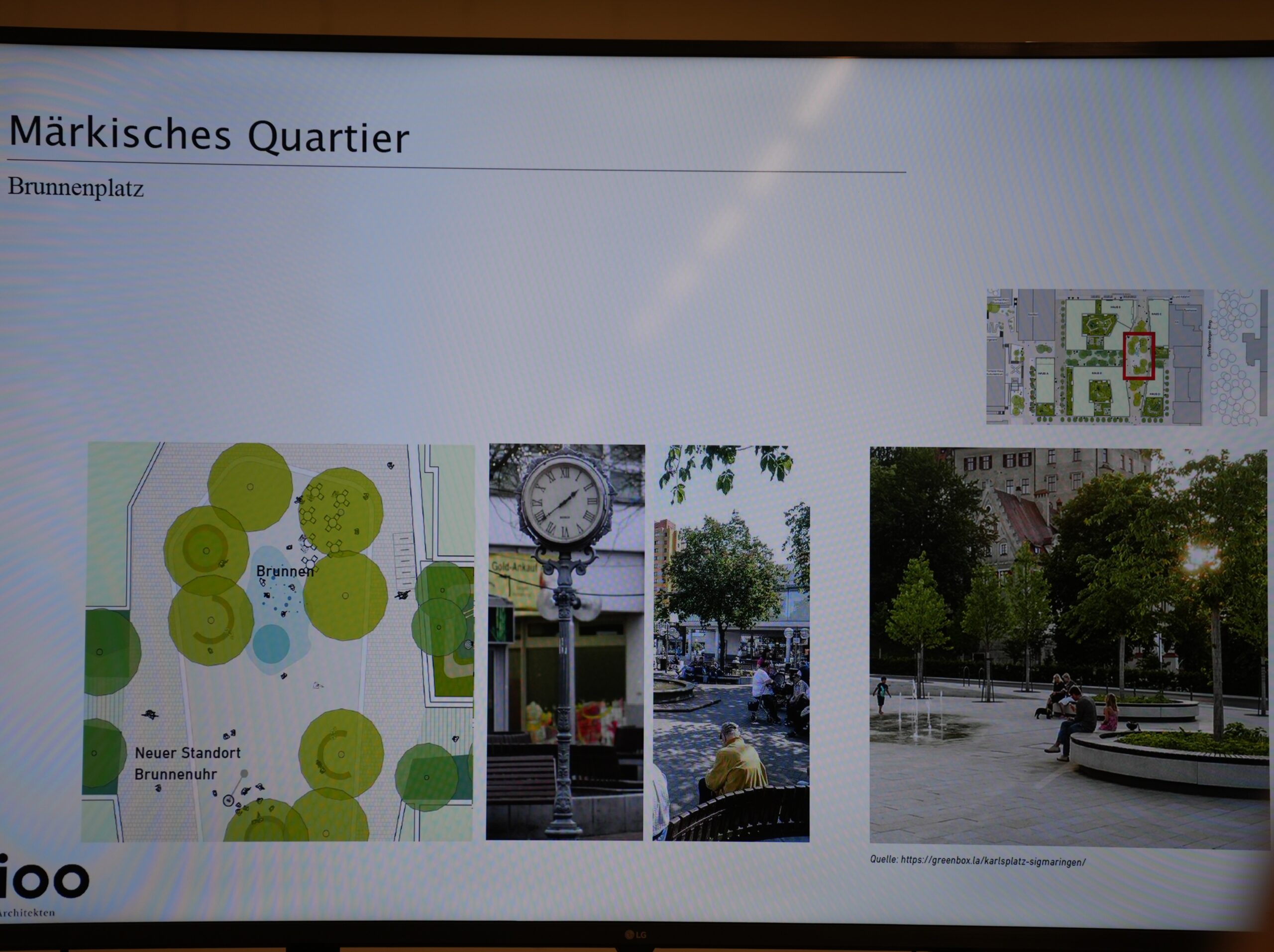 Ein zentraler Gedanke der Planung ist die Rückkehr des Brunnenplatzes. In der Präsentation wurde direkt aus märkischesviertel.de zitiert und ein Foto von 2014 gezeigt. Der Platz, den viele hier im Kopf haben mit den Bänken, den Bäumen, der Uhr und dem Brunnen, wurde als Teil der Geschichte des Viertels beschrieben, nicht nur als nette Erinnerung.