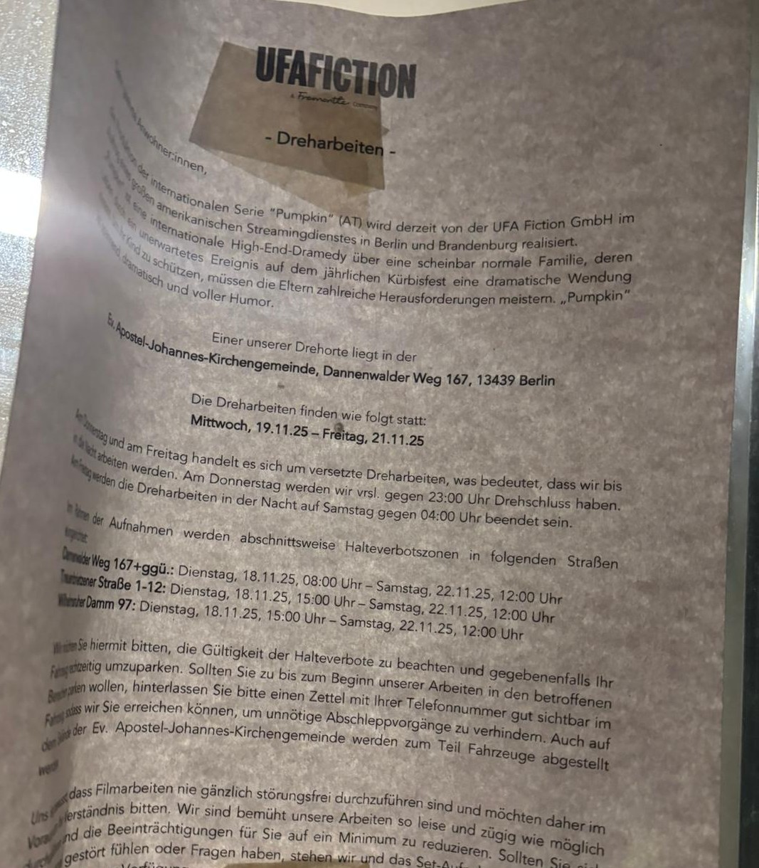 Laut dem Aushang der Produktionsfirma UFA Fiction finden hier aktuell Dreharbeiten zur internationalen Serie „Pumpkin“ (AT) statt, einer Dramedy, die für einen amerikanischen Streamingdienst produziert wird. Einer der Drehorte liegt in der Apostel-Johannes-Kirchengemeinde am Dannenwalder Weg.