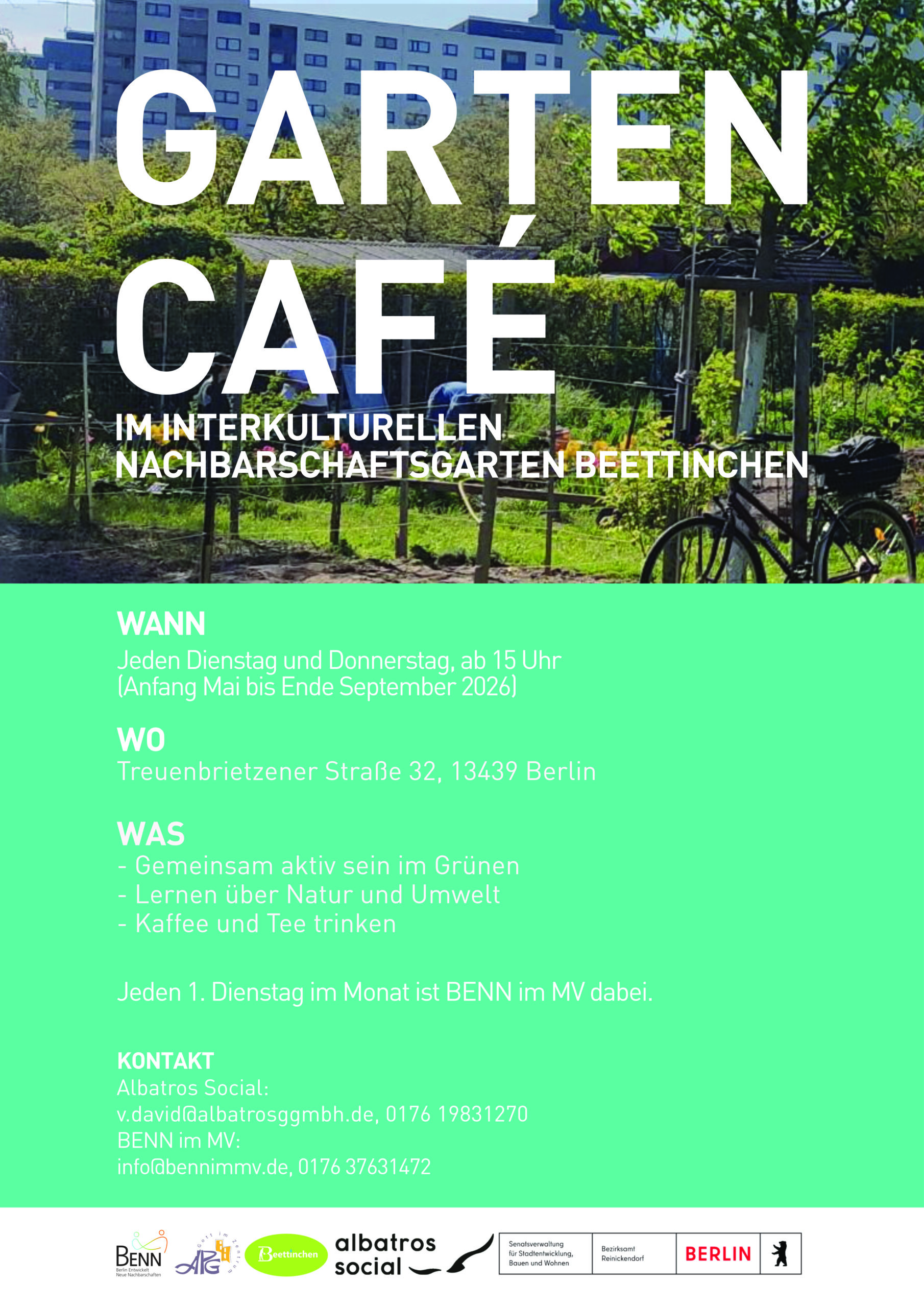 Mit der Saisoneröffnung beginnt auch wieder das regelmäßige Garten Café im Beettinchen. Es findet von Mai bis Ende September jeden Dienstag und Donnerstag ab 15 Uhr statt. Das Angebot richtet sich an alle, die im Garten mitmachen, sich austauschen oder Zeit vor Ort verbringen möchten. Am ersten Dienstag im Monat ist zusätzlich BENN im MV vor Ort.