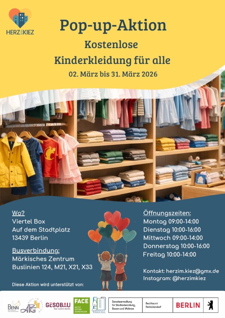Der Pop up Laden zur kostenlosen Weitergabe der Kinderkleidung öffnet vom 2. März bis zum 31. März 2026 in der VIERTEL BOX auf dem Stadtplatz im Märkischen Viertel. Das Angebot richtet sich an alle Familien und ist ohne Voraussetzungen nutzbar. Die Ausgabe erfolgt kostenlos.
