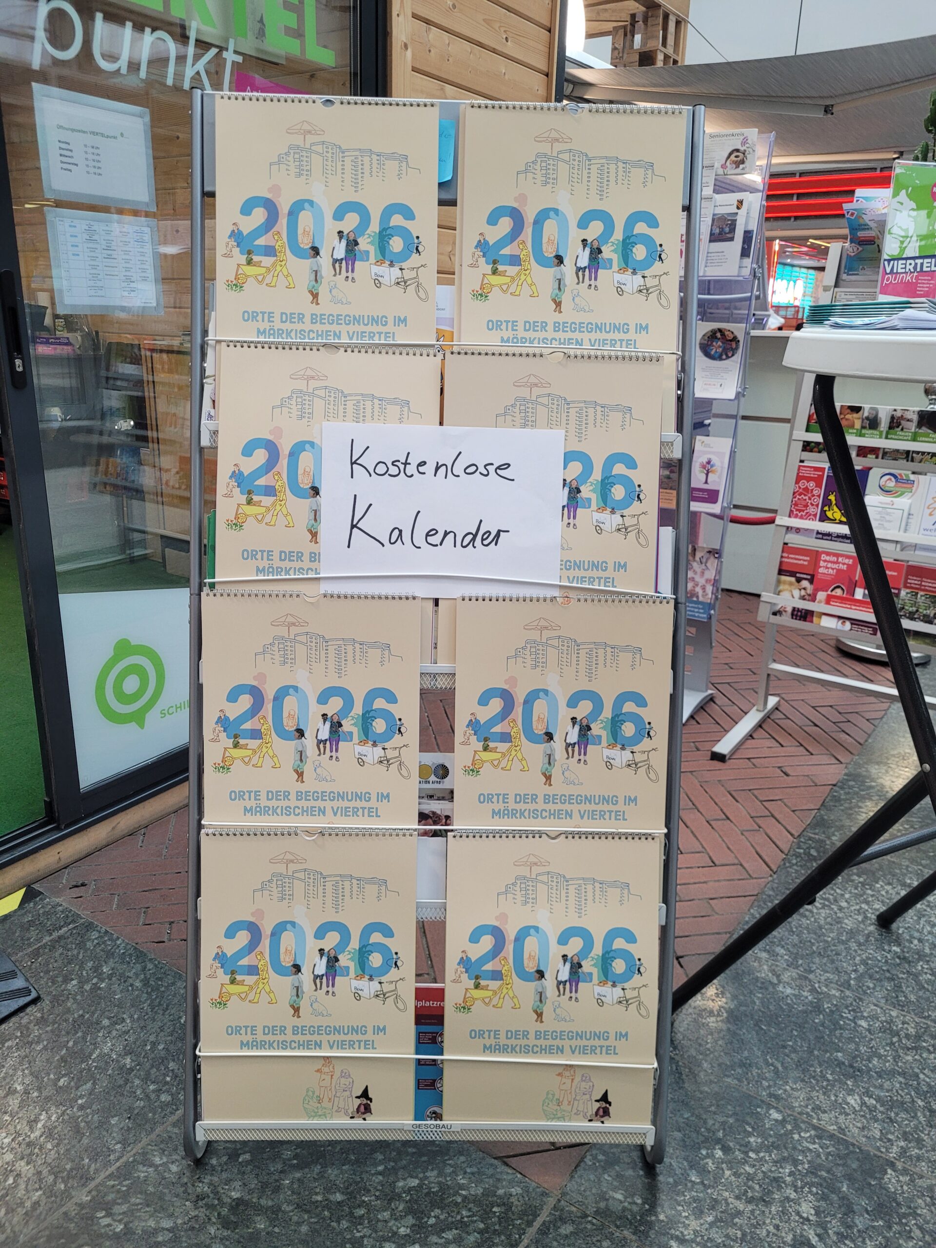 Im VIERTELpunkt liegt ein kostenloser Wandkalender aus. Er trägt den Titel Orte der Begegnung im Märkischen Viertel und stellt Monat für Monat Einrichtungen und Treffpunkte vor, die den Alltag im Viertel prägen. Der Kalender ist kostenlos erhältlich und richtet sich an alle und an die sich im Viertel orientieren oder neue Angebote kennenlernen möchten.