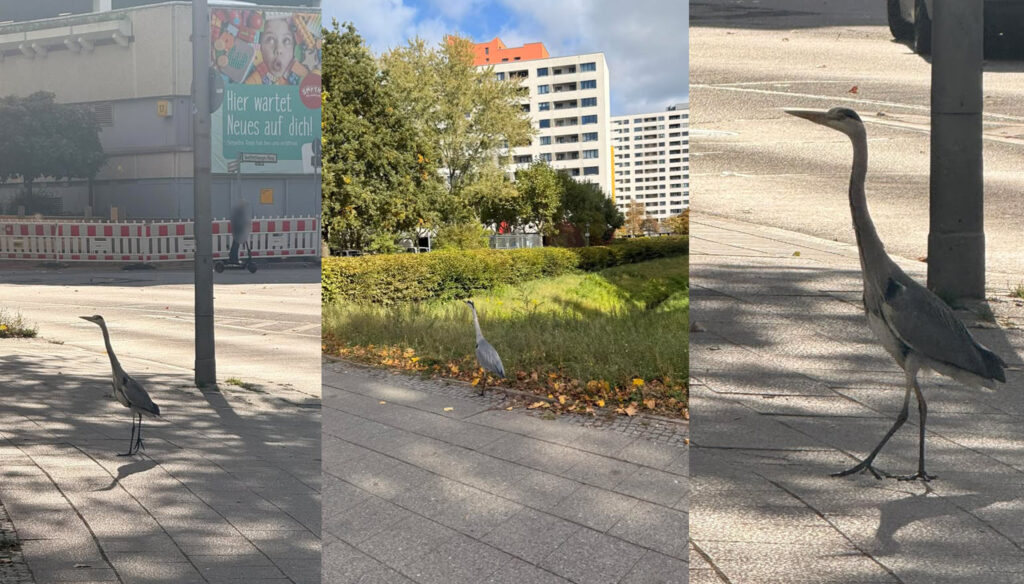 🕊️ Spaziergänger im Märkischen Viertel Leser Benjamin hat uns am 11.10.2025 eine ganz besondere Begegnung gemeldet: Ein Graureiher spazierte seelenruhig über den Senftenberger Ring, als würde er hier wohnen. Danach schlenderte er gemütlich den Grünstreifen entlang, ganz entspannt, mitten im Kiez. Solche Momente zeigen, wie viel Natur im Märkischen Viertel steckt, selbst zwischen Beton, Straßen und Hochhäusern. 🌿Manchmal muss man nur genau hinschauen, um kleine Wunder zu entdecken. 📸 Vielen Dank an Benjamin für die FotosManchmal entdeckt man Orte, die man eigentlich schon längst kennen müsste. Gestern stand ich (Lux) mit meinem Viertelreporter-Kollegen (HighFly) hinter der Postbank, in der Königshorster Straße, Kamera auf dem Stativ. Blickwinkel, die ich in all den Jahren hier nie wahrgenommen habe, fast fremd und doch vertraut. Bald wird hier gebaut. Dort, wo ich stand, entsteht ein neues Wohnhaus (siehe Beitrag). Vielleicht sind diese Fotos also der letzte Moment, in dem man diesen Ort so sehen konnte, bevor er sich verwandelt.Mitten in der Nacht zeigt die Quickborner Straße ihr eigenes Gesicht. Vier Aufnahmen, eingefangen zwischen Licht und Stille, festgehalten mit der Kamera, die jedes leise Detail sichtbar macht. In solchen Momenten spürt man, wie selbst vertraute Straßen ein Geheimnis tragen, wenn die Stadt schläft und nur das Licht noch spricht. Die Fotos wurden von Viertelreporter Lux in den Nächten vom 12./13. und 14. Oktober 2025 in der Quickborner Straße und dem Wilhelmsruher Damm geschossen. Der Himmel scheint zu atmen, das Grau der Stadt wird weich, fast zärtlich vom Abend gefärbt. Man spürt, dass Schönheit oft einfach da ist, wenn man den Blick hebt. Das Foto wurde von Viertelreporter Lux im Märkischen Viertel geschossen.Manchmal malt der Himmel selbst ein Zeichen über das Märkische Viertel Heute (4.10.2025) früh um 07:25 Uhr, aufgenommen aus dem Eichhorster Weg Richtung Finsterwalder Straße. Manchmal braucht es kein Wort, kein Filter, kein Symbol. Ein Regenbogen reicht. Er erinnert daran, dass selbst nach grauen Nächten wieder Farbe über die Stadt zieht – leise, ohne Aufhebens, einfach da. Wir bedanken uns bei Catherine 🎨 Streetart im Märkischen Viertel! Viertelreporter Kiez im Visier hat dieses Kunstwerk in der Finsterwalder Straße entdeckt: Ein Porträt von Sido auf einem Stromkasten. Ob Fan oder einfach Liebhaber*in von Straßenkunst, solche Bilder machen unser Viertel bunter und erzählen ein Stück Geschichte. 👉 Kanntet ihr dieses Motiv schon? Und wo habt ihr im MV noch Streetart entdeckt?Ein Blick nach oben zeigt, wie klar und ruhig der Spätsommer sein kann. Beton, Grün und Himmel verschmelzen zu einem Bild, das uns erinnert: Auch zwischen Hochhäusern findet sich Schönheit, wenn wir den Moment bewusst wahrnehmen. Das Foto wurde am Wilhelmsruher Damm geschossen.Abendstimmung über dem Märkischen Viertel Gestern erreichte uns dieses wunderschöne Bild von Paulina. Der Himmel legt sich wie ein Gemälde über die Häuser, grau und schwer, doch am Horizont brennt ein Lichtstreifen in Orange und Rot. Es ist, als würde der Tag sich verabschieden und uns daran erinnern, dass selbst hinter Wolken ein Leuchten wartet. Das Foto wurde am 11. September 2025 geschossen.Zwischen Gittern und Balkonen entsteht ein Bild, das vom Leben im Viertel erzählt. Das Foto wurde vom Viertelreporter Kiez im Visier am Senftenberger Ring geschossen.