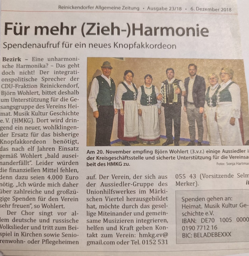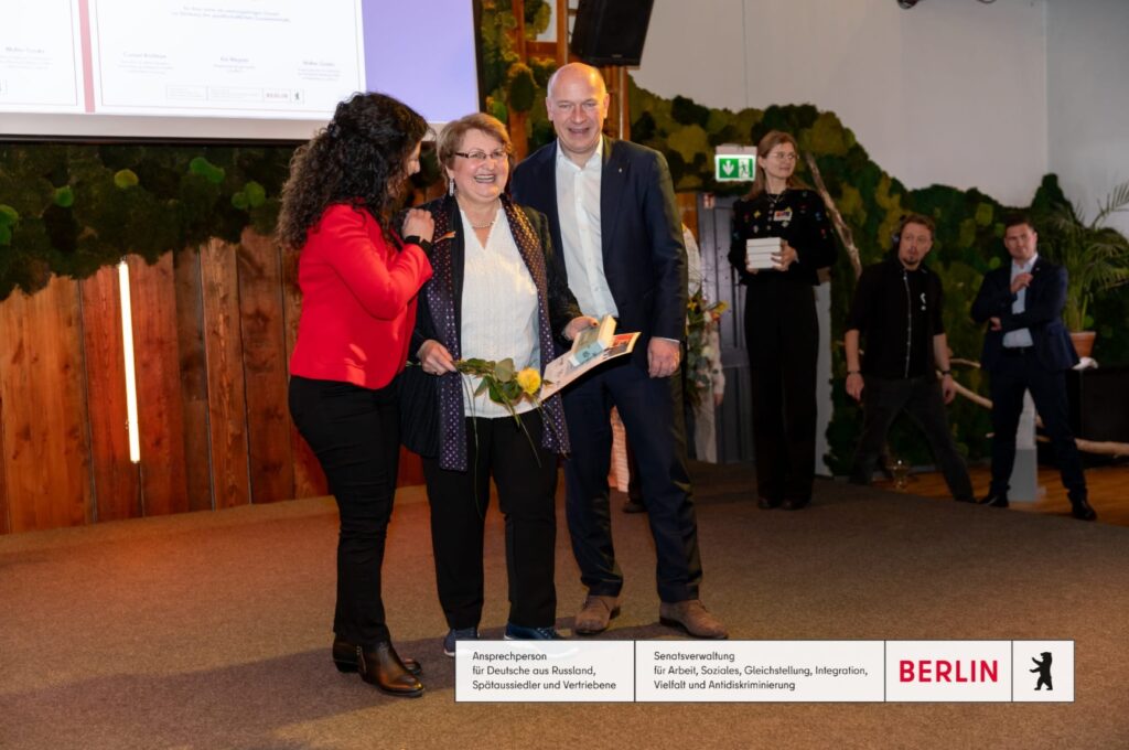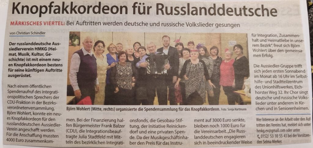 Selma Merker ist in Kasachstan in einem deutsch geprägten Dorf aufgewachsen, in dem Sprache, Lieder und Traditionen über Generationen weitergegeben wurden. Seit 1993 lebt sie in Berlin. Nach einem Sprachkurs machte sie eine Ausbildung zur Altenpflegerin und arbeitete bis zur Rente in diesem Beruf. Neben ihrer Familie mit drei Kindern und acht Enkelkindern hat sie über viele Jahre Strukturen aufgebaut, die Menschen zusammenbringen. 2007 gründete sie beim Unionhilfswerk die Aussiedlergruppe, die sich bis heute jeden ersten Samstag im Monat trifft und im Dezember ihr 18 jähriges Bestehen gefeiert hat. Später kam Selmas Rezepte Tauschgruppe dazu. Aus diesem Umfeld entstand auch der Chor Heimat. Ende 2017 wurde daraus der Verein Heimat. Musik Kultur Geschichte e.V., damit diese Arbeit auf festen Beinen steht und nicht nur von einzelnen Terminen abhängt.